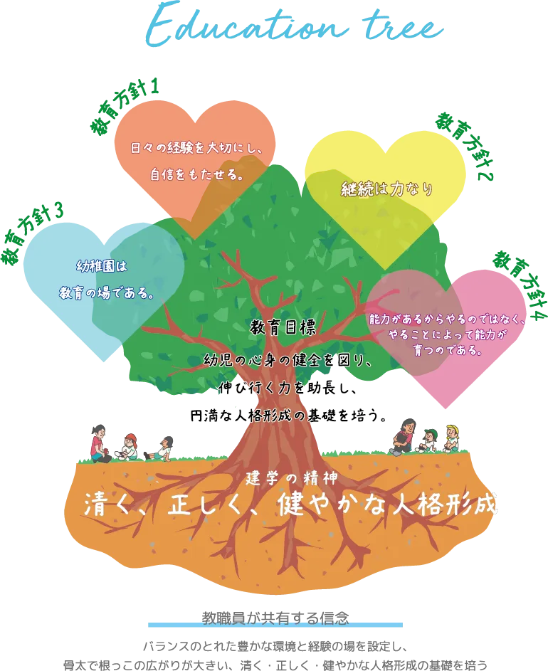 必要な教育を十二分に幼児期に培った体験は原体験として子どもたちの心に何らかの形でずっと残ると言われます。人格形成の最も大切なこの時期にたくさんの「嬉しい」「楽しい」「やってみたい」を実感できるように、豊かな環境と経験の場を設定しています。